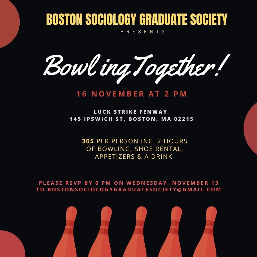 You are invited to join Boston-area Sociology doctoral students for our November Get-together on Saturday, Nov. 16 at 2 PM EST at Lucky Strike Fenway! The price of the event is $30 dollars (per person) and includes two-hour bowling, shoe rental, appetizers, and one drink ticket.
